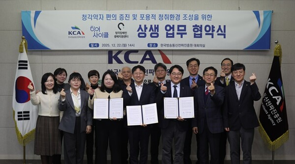 한국방송통신전파진흥원(이하 KCA)은 지난 22일 히어사이클, 청각장애인생애지원센터와 KCA 본원에서 청각장애인 및 난청인의 정보 접근성 향상을 위해 ‘청각약자 편의 증진 및 포용적 청취환경 조성을 위한 3자 상생 협약’을 체결했다.