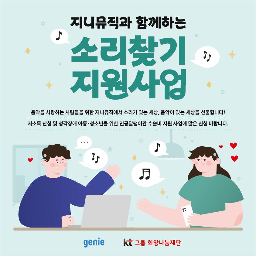 인공와우 수술 지원을 위해 지니뮤직은 청각장애인생애지원센터와 함께 기초생활수급자, 차상위계층, 또는 건강보험료 기준 중위소득 150% 이하 가정의